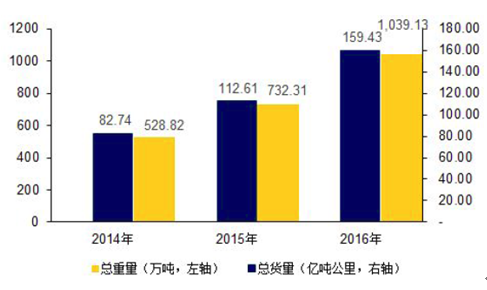 2014年至2016年,分别实现年运输货量528.82万吨、732.31万吨和1,039.13万吨,年均增长率达到40.19%,年运输票数5,440.03万票、9,994.01万票和20,263.97万票,年均增长率为93.24%,远高于全国公路货运量的年增长率。